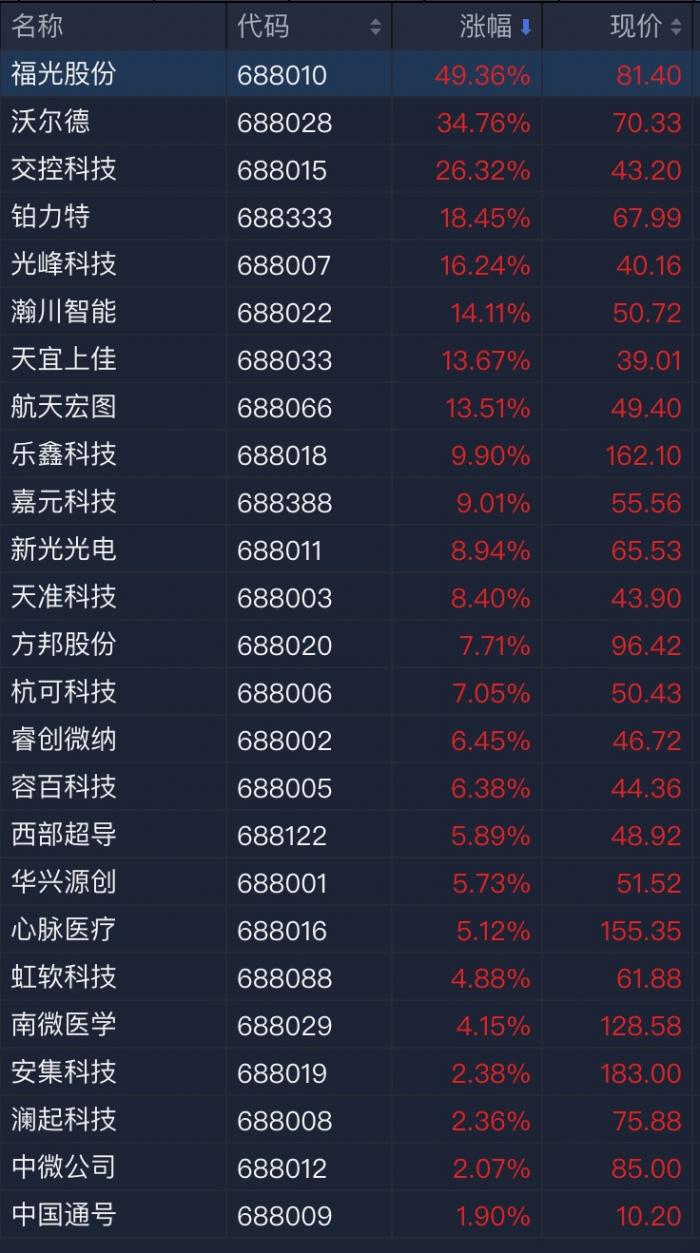 个股涨幅表现分化明显。其中福光股份大涨49.36%,沃尔德涨34.76%,成为当天涨幅最好的两只个股。而中国通号、中微公司、澜起科技、安集科技涨幅垫底,依次为1.90%、2.07%、2.36%、2.38%。