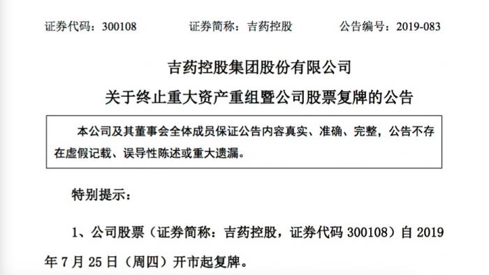 7月24日晚间,停牌中的吉药控股发布公告,宣布终止购买修正药业集团股份有限公司(下称“修正药业”)100%股权,并 7 月 25 日(周四)开市起复牌。