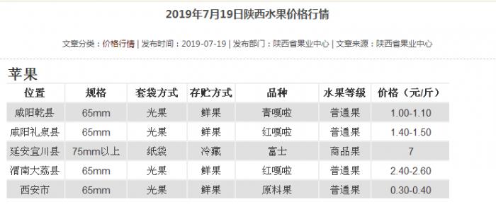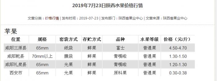 21世纪经济报道记者查询陕西省果业中心的数据显示,7月23日,陕西水果行情中除了此前的青嘎啦和红嘎啦,多出了一个新的鲜果品种——富士,65MM规格的每斤4.5-4.7元。不过,这类富士的水果等级为“普通果”。此外,青嘎啦、红嘎啦等苹果品种,也在陆续进入市场。