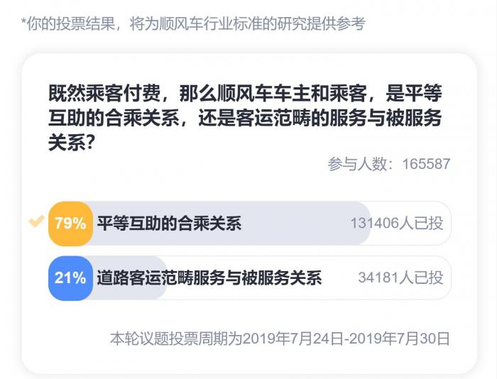 据悉,“顺风车行业标准课题研究集思会”首期议题为“既然乘客付费,那么顺风车车主和乘客,是平等互助的合乘关系,还是客运范畴的服务与被服务关系?” 公众可通过中国交通报,中国交通运输协会共享出行分会,城市智行研究院,以及嘀嗒出行等机构的线上媒体平台参与投票和评论。公众的意见和建议在进行汇总梳理之后,将提交给有关部门。