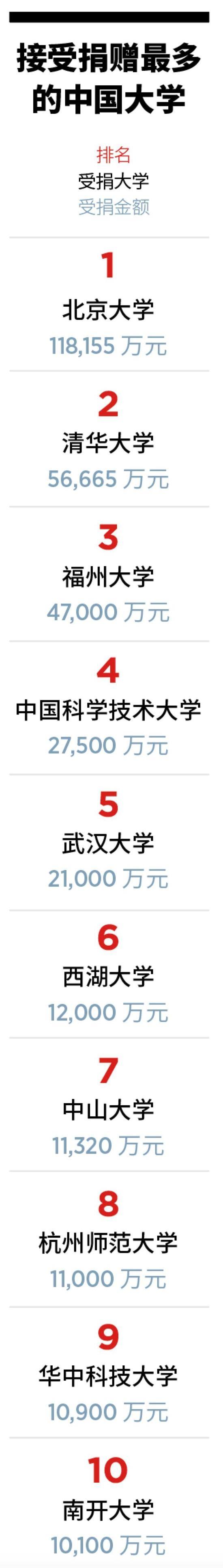 榜单显示,2018 年,国内各高校共计受捐43.6亿元,前十名受捐大学分别是北京大学、清华大学、福州大学、中国科学技术大学、武汉大学、西湖大学、中山大学、杭州师范大学、华中科技大学、南开大学。可以看到,位列前三的北京大学、清华大学、福州大学受到的捐赠金额占据了总金额的一半。