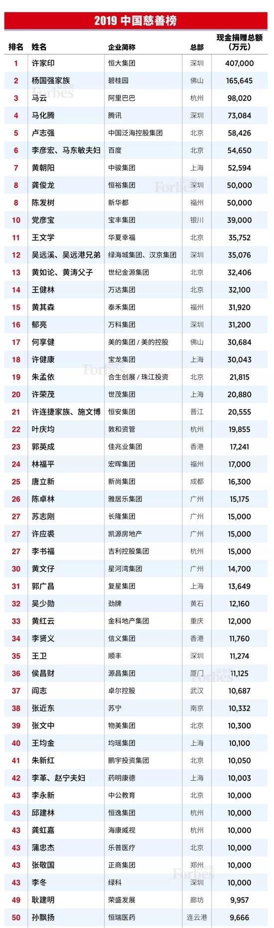 2019福布斯中国慈善榜全榜