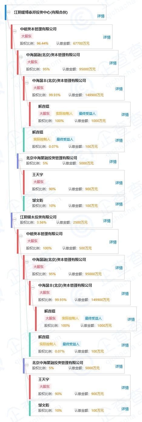 法尔胜2019年一季报显示,江阴耀博泰邦投资中心(有限合伙)是其第二大股东,持股15%。企查查显示,江阴耀博泰邦投资中心(有限合伙)由中植资本管理有限公司与江阴银木投资有限公司分别持股96.44%、3.56%,穿透后疑似实际控制人为“中植系”掌舵人解直锟,持股95%。