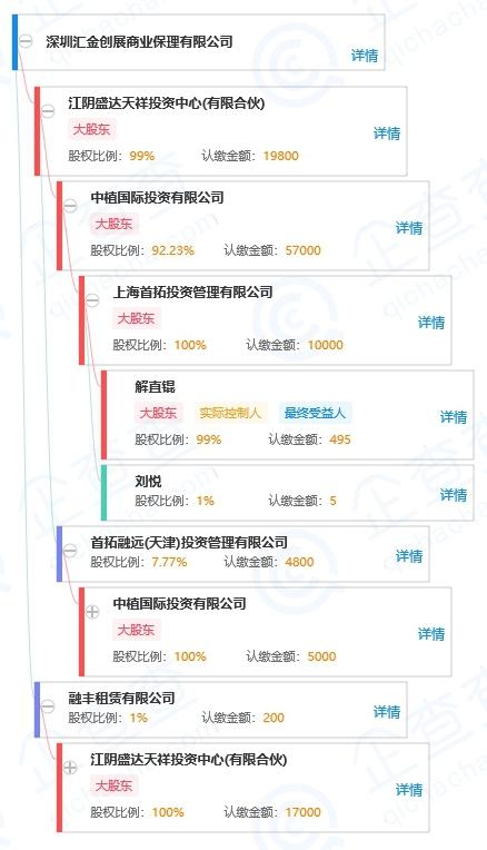 接盘方来看,企查查显示,深圳汇金创展商业保理有限公司由江阴盛达天祥投资中心(有限合伙)和融丰租赁有限公司分别持股99%、1%,穿透后疑似实际控制人为也为解直锟,持股99%。