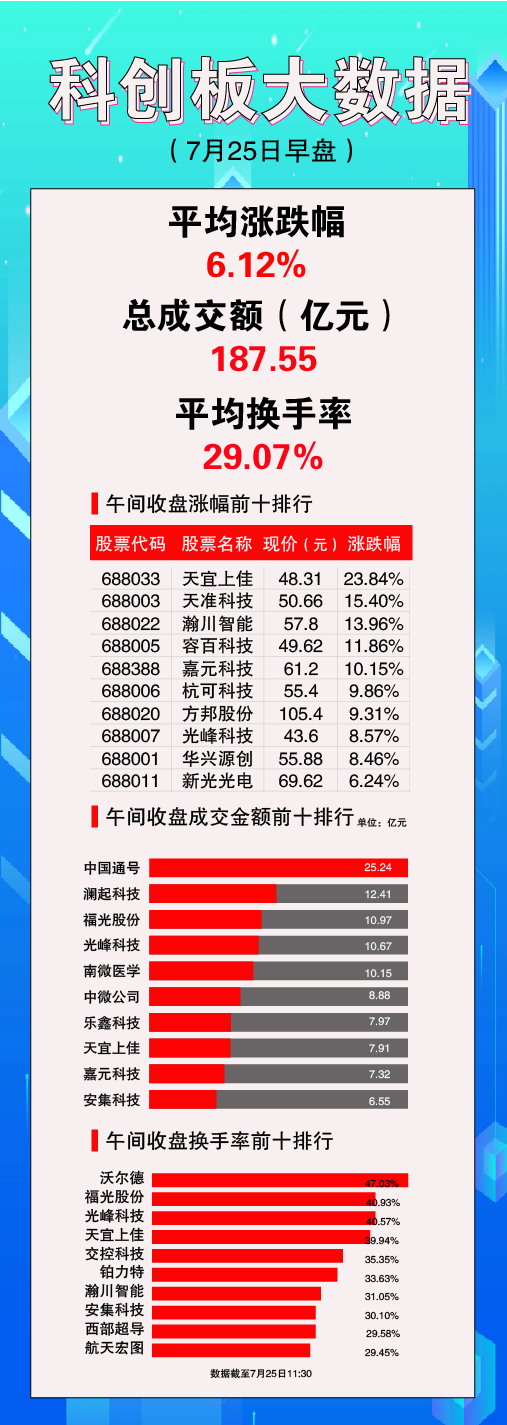 个股方面,科创板保持强势,25股中仅有福光股份和乐鑫科技下跌。天宜上佳盘中涨幅一度逼近30%,瀚川智能、天准科技、容百科技、嘉元科技涨幅均超过10%。从振幅上看,科创板个股趋于稳定,目前仅有天宜上佳和沃尔德超过20%,乐鑫科技、中微公司、澜起科技等不到10%。中国通号成交超25亿元居首,瀚川智能、铂力特、新光光电、华兴源创、方邦股份成交额低于5亿元。