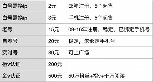 根据购买渠道和市场热度,小号的价格会出现浮动,有时候买号甚至不异于一次股市投资。在闲鱼上,一个微博小号的价格从0.4元到上百元不等。一次性号最便宜,批发价在0.25元-0.9元。全新注册小号售价2元至3元,但需要用户更换IP,且随时可能会被封禁。稳定老号(09年-16年注册的账号)可卖到15元,8-10级自养的微博账号卖20元。高权重的轮博号(即轮番发微博,多次转发)价值25元。实时号(即内容可以上精选、热门和广场的账号)价值80元。橙V(自媒体认证号)、金V(橙V进阶版,拥有50万粉丝、千万阅读量)账号则更贵,可卖到200元和500元。