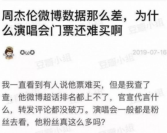 7月17日当天,有网友在豆瓣发帖质疑:“周杰伦微博数据那么差,为什么演唱会门票还难买啊?”但周杰伦的微博数据难看,真的就能代表周杰伦的商业价值低、影响力不足吗?