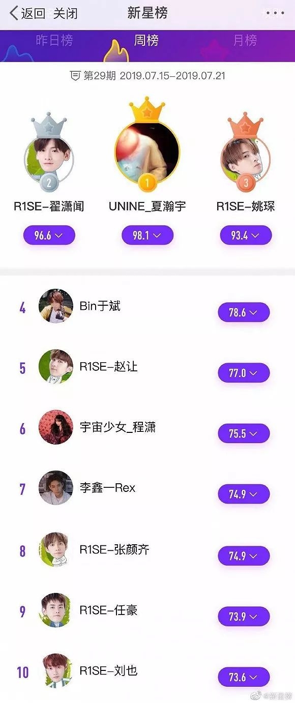 2019年第29期新星榜周榜(图源:新星榜微博)