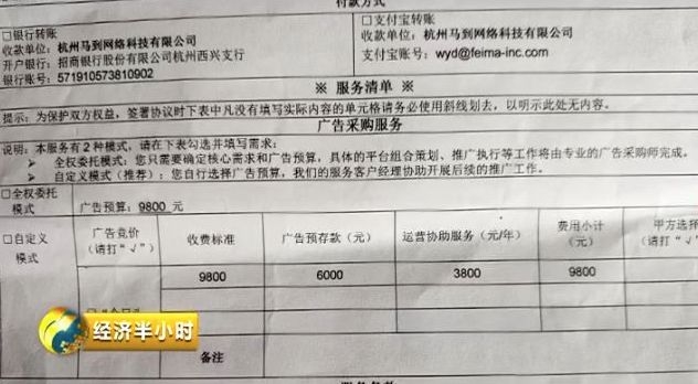 类似小吴遇到的这种情况并不是个例,杭州马到网络公司与巨量引擎公司的服务如出一辙。若卖家想要取得合作,要在杭州马到网络公司缴纳10万元的保证金,综合服务协议中还明确约定:广告预算首次充值金额为9800元。其中,广告预存款6000元,运营协助服务费3800元。而关于后期流量费用,保证金是否能退,工作人员支支吾吾。而合同小项中明文表示“合同一旦签订,相关费用无法退还,只能消耗与使用”。