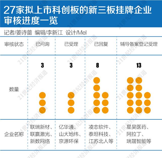 数据显示,截至7月25日,目前还有27家挂牌新三板企业拟转板科创板。其中有13家企业为辅导备案登记受理状态,3家为已受理状态,11家为已问询或已回复。