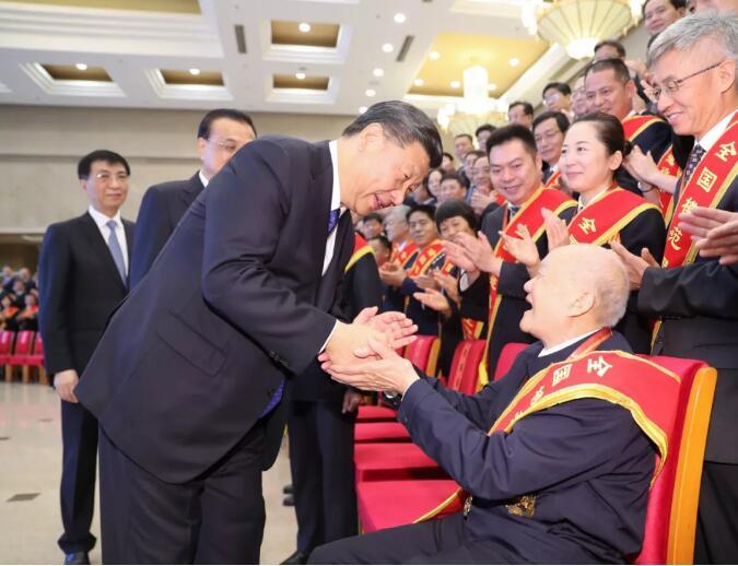 2019年1月,习近平总书记向获得2018年度国家最高科学技术奖的刘永坦、钱七虎颁发奖章、证书,同他们热情握手表示祝贺,并请他们到主席台就座。