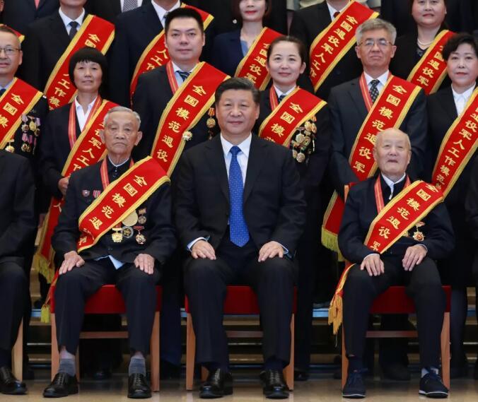 94岁的张富清、90岁的朱再保、85岁的崔道植、83岁的王於昌、83岁的王成帮,5位老军人坚守初心,为党和国家事业奉献了一辈子。作为全国退役军人的杰出代表,他们被特意安排在合影的第一排就座。在习近平总书记身旁的分别是张富清和朱再保。