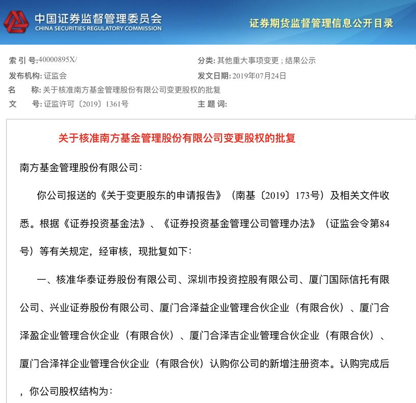 7月25日,证监会发布了《关于核准南方基金管理股份有限公司变更股权的批复》。