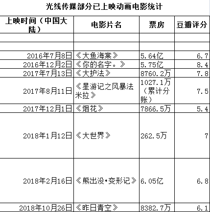 今年4月,光线传媒接受机构调研时曾表示,今年开始有望迎来动画大年,有望上映三部国产动画片,分别为《哪吒之魔童降世》《姜子牙》和《妙先生》。