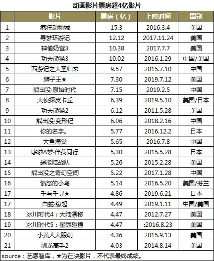 据艺恩数据显示,在目前内地影史上票房超4亿的动画影片仅有21部,而国产动画则仅有6部,大多数国产动画仍摆脱不了低幼的限制,在票房上很难有突破。