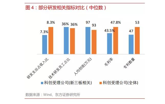 新三板相关的科创受理企业研发支出占收入比、毛利率、专利数量都显著低于整体水平,技术研发员工占比与整体水平大致持平,仅人均创收略高于整体水平。