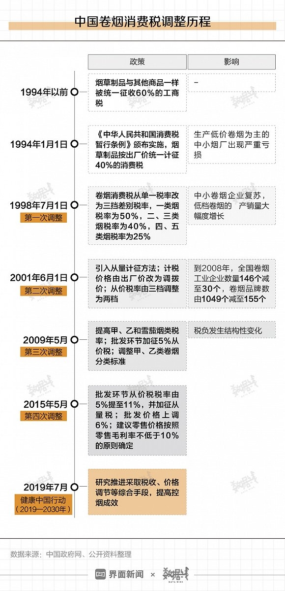 这并不是第一次提出要调整烟草税。据界面新闻2018年11月报道,中国正在试图通过立法途径来进一步提高烟草的价格和税收。回顾历史,1994年以来,中国卷烟消费税经历了四次调整。