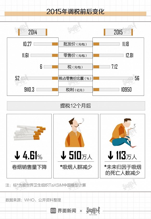 中国最近一次调整烟草税是在2015年5月。与2014年相比,2015年一至五类烟的批发价格和零售价格均有所增长。税占零售价比重从52%上升至56%,税利从9110亿元升至10950亿元。