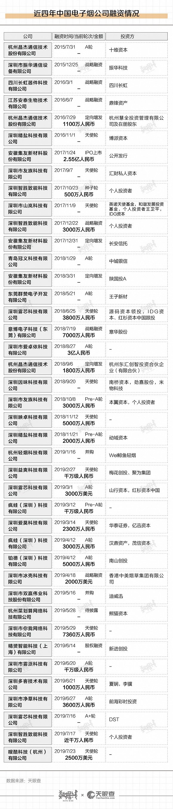 2019年,电子烟成了创投热点,创业者和资本都想“尝”一口电子烟。天眼查数据显示,近四年中国电子烟公司先后至少进行了45次融资,光2019年就有19次。