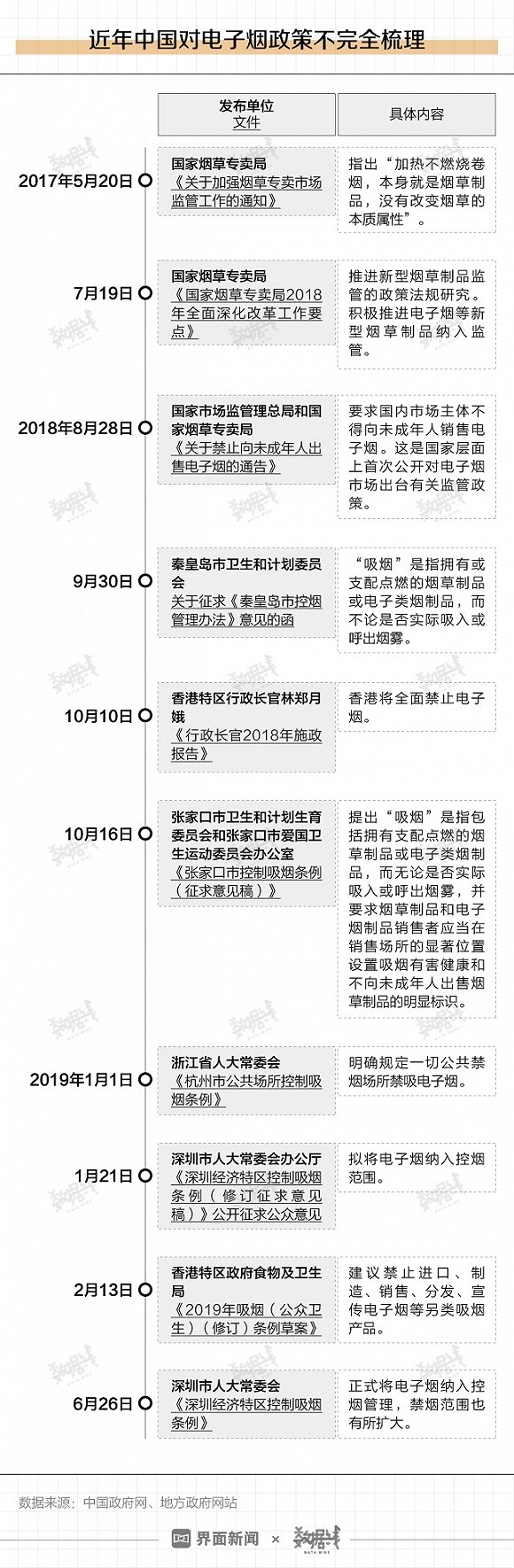 2019年以来,包括深圳市、秦皇岛市在内的数个地方出台的控制吸烟办法或条例中,都已明确将电子烟纳入禁烟范围。