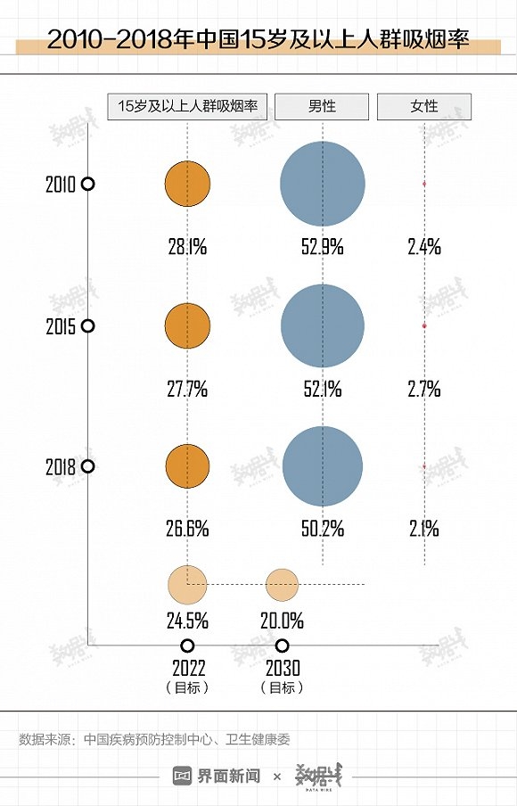 根据中国疾病预防控制中心发布的中国成人烟草调查结果,中国15岁及以上人群吸烟率逐年降低,2018年吸烟率为26.6%。《健康中国行动(2019-2030年)》中的控烟目标显示,到2022年和2030年, 15岁以上人群吸烟率分别低于24.5%和20%。