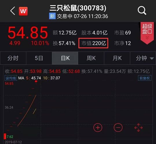7月26日,三只松鼠又毫无意外地开盘涨停,报54.85元,总市值220亿。按照最新市值计算,持股43.39%的第一大股东,公司实控人、董事长章燎源身家已经95亿元,一跃成为安徽省首富。据2018年胡润富豪榜显示,安徽首富田明的身家为92亿。
