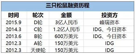 在成立后的第二个月,三只松鼠就获得了“国潮品牌” 执牛耳者IDG资本150万美元的天使投资,拿到第一笔创业资金;次年又获“投资女王”徐新的今日资本投资。此后IDG不断增加投资,2015年获得的峰瑞资本的3亿人民币的投资,而峰瑞资本正是IDG前合伙人李丰创立的。