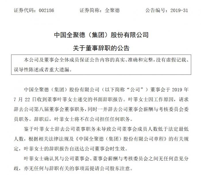 而最新一则高管离职公告就在几天前的7月22日,董事叶菲因工作原因递交书面辞职报告,辞去公司第八届董事会董事职务,同时一并辞去公司董事会薪酬与考核委员会委员职务。对此,全聚德董事会强调:“叶菲女士确认其与公司董事会、董事会薪酬与考核委员会之间无任何意见分歧,亦无任何与辞职有关的事项需提请公司股东注意。”