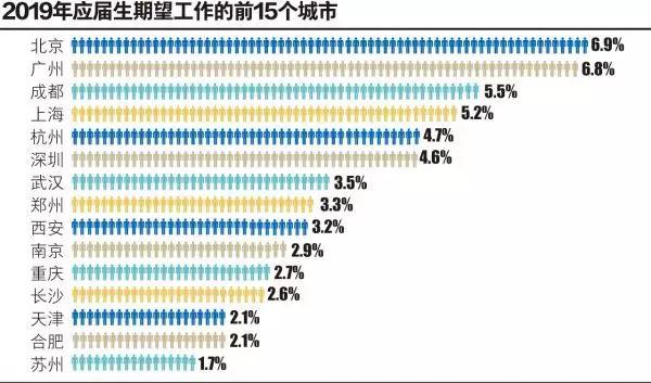 根据日前BOSS直聘发布《2019年高校应届生专业就业竞争力观察》数据显示,2019年应届生毕业生期望工作的前十五强城市,依次是北京、广州、成都、上海、杭州、深圳、武汉、郑州、西安、南京、重庆、长沙、天津、合肥、苏州。其中,除合肥外全部是一线城市与新一线城市。另外,新一线城市成都仅次于北京与广州,超过上海与深圳位列第三。