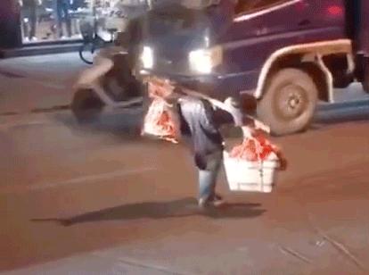 扁担挑着的,是老人日常贩卖维持生计的水果。