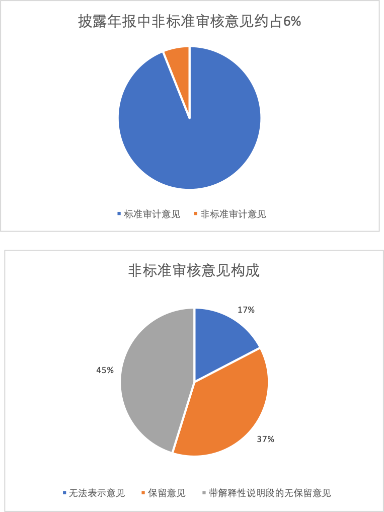 截至2019年4月30日,除*ST华泽、*ST长生、*ST新亿、*ST毅达、*ST东南5家公司外,沪深两市共有3622家公司披露了经审计的2018年年度财务报告。按期披露年度财务报告的公司中,219家公司年度财务报告被出具非标准审计意见的审计报告,其中,38家被出具无法表示意见,82家被出具保留意见,99家被出具带解释性说明段的无保留意见。