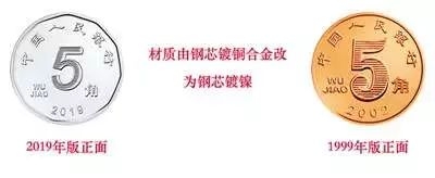 而2019年版第五套人民币的5角硬币,材质将全部改为钢芯镀镍。自然硬币颜色也就由金黄色变为了镍白色。