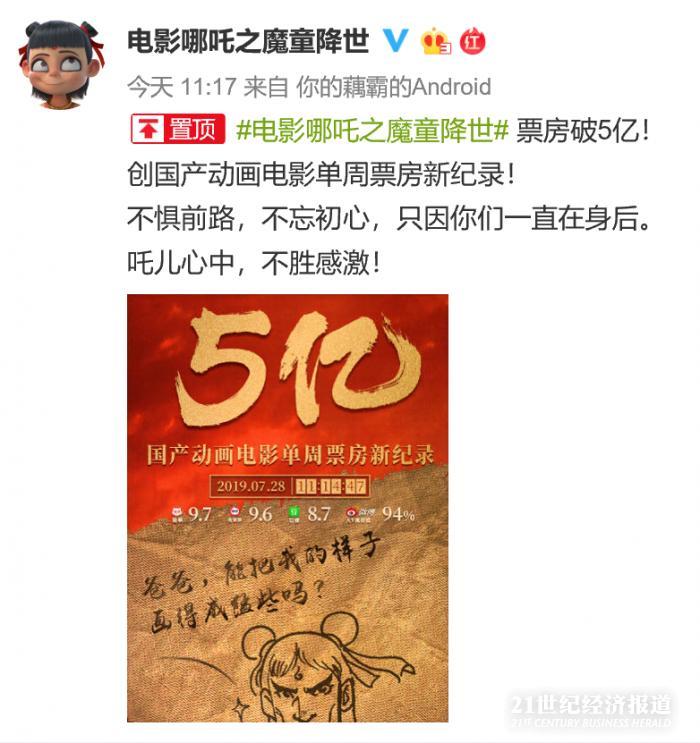 根据电影《哪吒之魔童降世》官方微博,截至2019年7月28日11:14,累计票房已突破5亿,创下国产电影票房新纪录。口碑方面,微博大V推荐度94%,豆瓣8.7,猫眼9.7,淘票票9.6。