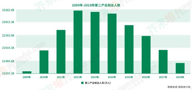 根据国家统计局数据显示,尽管第二产业就业人员数量在2012年增长至顶点后连续多年下降,且在总就业人数中占比逐渐减少,但2018年中国第二产业就业人员数量仍达2.13亿人,约占全国总就业人口的28.6%。