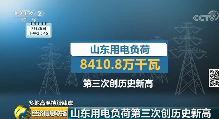 26日下午1:45,山东用电负荷第三次创历史新高,达到8410.8万千瓦。24日以来,烟台、淄博、菏泽等7个城市用电负荷创新高。