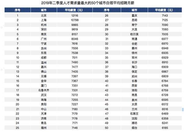 报告显示,2019年第二季度,人才需求量前50城白领平均招聘月薪为7362元。其中北京平均月薪为12116元,紧随其后的上海、杭州、深圳分别为10798元、9865元、9819元。广州延续了一季度榜单的成绩,排在第6位,和“北、上”拉开差距,平均月薪为8046元。