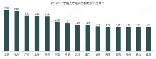 报告称,2019年第二季度,各城市人才吸引力指数变化较大。北京继续位列第一,广州首次以微弱优势超过上海、深圳,进入前三名。杭州已经稳列第一集团,与一线城市在同水平竞争。同时,厦门凭借较高的人才关注度,郑州凭借充沛的人才供给,佛山凭借均衡的供需水平,在二季度纷纷入围十五强。