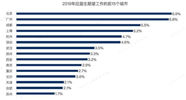每年的二季度都是应届高校毕业生最后的求职旺季,今年也不例外。数据显示,2019年应届生岗位平均招聘月薪为5580元。同时,应届生最期望前往就业的15个城市除合肥外,全部为一线和新一线城市。杭州和成都均进入前五名,甚至超过了上海和深圳。伴随着户籍改革等人才政策红利的到来,向新一线城市进发,是近几年高校应届生的普遍选择。相比于竞争高度激烈的一线城市,年轻人对城市环境和生活质量也有了不同于前辈的要求。