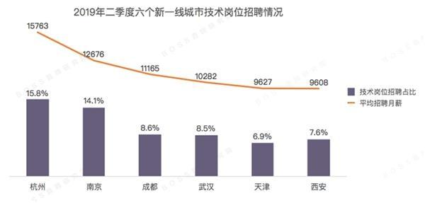 同时,前沿技术岗位继续垄断高薪排行榜,推荐算法岗位的招聘月薪仍然最高。六个重点观察的新一线城市对技术人才的招聘薪资环比均有增加,其中天津环比增幅最高,为5.9%。然而,这六个城市对技术人才招聘量的整体占比均较一季度有小幅下降,侧面反映出这六个新一线城市对技术人才的准入门槛在逐步提高。