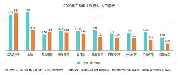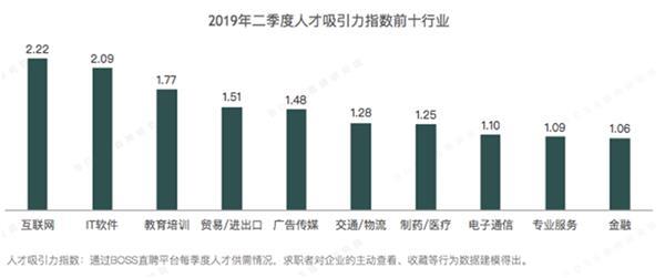 报告称,2019年二季度,各行业人才吸引力指数普遍回升。互联网行业再次回归首位,人才吸引力指数环比上涨33.1%。与此同时,贸易/进出口行业的人才吸引力指数异军突起,跃居第四位。
