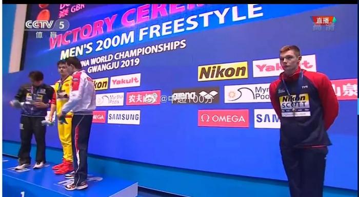 在两天后的男子200米自由泳决赛中,孙杨以1分44秒93的好成绩获得冠军,赢得世锦赛二连冠,这个成绩,全球至今仅此一人。但在比赛结束后的颁奖仪式上,获得铜牌的英国选手邓肯·斯科特也玩起了霍顿的套路,拒绝与孙杨合影。