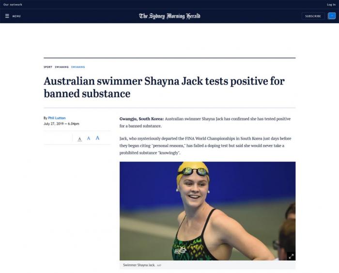 就在西方各大媒体以及运动员大放厥词、无中生有地攻击诋毁“双冠”孙杨时,7月27日,澳大利亚《悉尼先驱晨报》透露,澳大利亚女子游泳运动员莎娜·杰克(Shayna Jack)被检测出服用禁药,“喜提”药检阳性。她本人已在7月14日,以“个人原因”退出本次世锦赛。澳大利亚泳协当时拒绝透露其退赛原因。