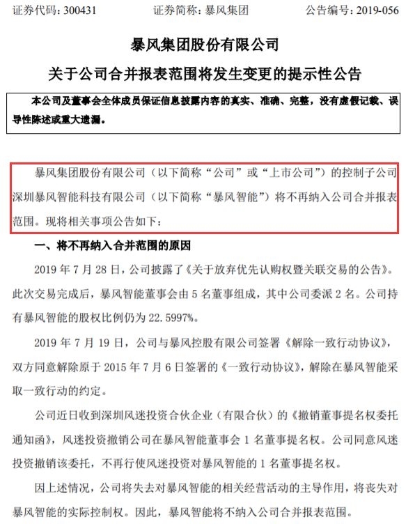 公告显示,2019年7月19日,暴风集团与暴风控股有限公司签署《解除一致行动协议》,双方同意解除原于2015年7月6日签署的《一致行动协议》,解除在暴风智能采取一致行动的约定。同时,暴风集团近日收到深圳风迷投资合伙企业(有限合伙)的《撤销董事提名权委托通知函》,风迷投资撤销公司在暴风智能董事会1名董事提名权。公司同意风迷投资撤销该委托,不再行使风迷投资对暴风智能的1名董事提名权。