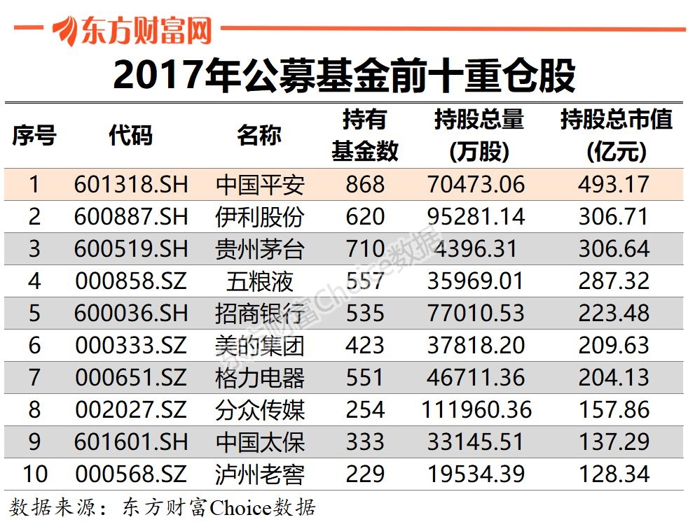 数据显示,中国平安、贵州茅台、五粮液、招商银行等是今年上半年基金最喜欢的股票,持有这几只股票的基金数量最少也有670家,持仓总市值超过300亿元,此外,伊利股份、格力电器、美的集团、泸州老窖、兴业银行、恒瑞医药也跻身基金持仓前10。