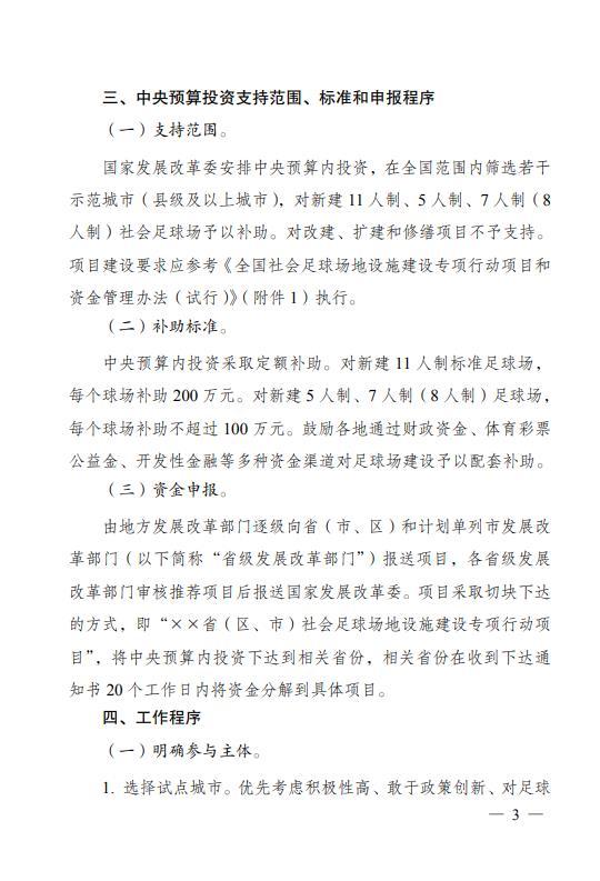 《方案》指出,国家发展改革委安排将中央预算内投资,在全国范围内筛选若干示范城市(县级及以上城市),对新建 11人制、5人制、7人制(8人制)社会足球场予以补助。对新建 11人制标准足球场,每个球场补助 200 万元。对新建 5人制、7人制(8人制)足球场,每个球场补助不超过100万元。