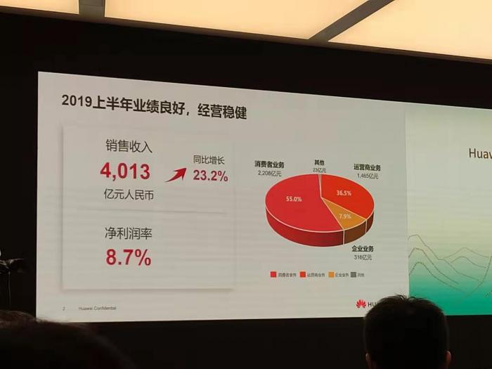 2019年上半年,华为销售收入4013亿元人民币,同比增长23.2%,净利润率8.7%。