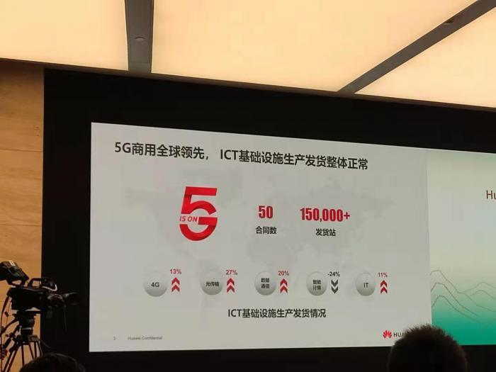 运营商业务收入为1465亿元。无线网络、光传输、数据通信、IT等生产发货情况总体平稳。目前,华为已获得了50个5G商用合同,累计发货超过15万个基站。