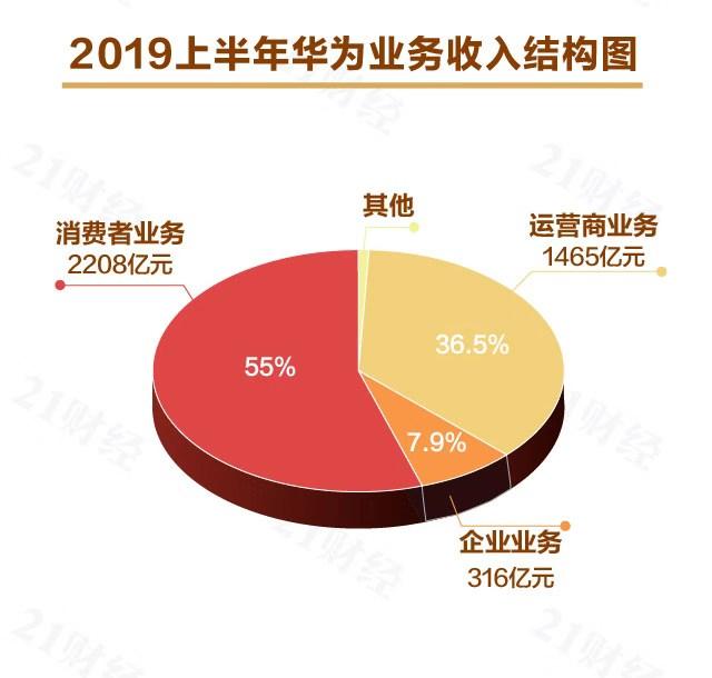 2019年上半年,华为实现销售收入4013亿人民币,同比增长23.2%,净利润率8.7%。其中,运营商业务收入1465亿元,企业业务316亿元,消费者业务2208亿元。