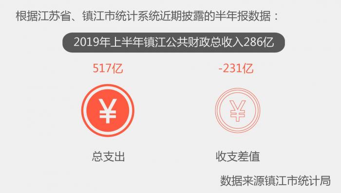 根据江苏省、镇江市统计系统近期披露的半年报数据,2019年上半年镇江公共财政总收入286亿,总支出517亿,收支差值-231亿。并且,按政府运作逻辑,由于财政支出安排早在2019年初已经市人大表决通过,从这个角度看,2019年下半年将是镇江财政支出压力最大的时刻。