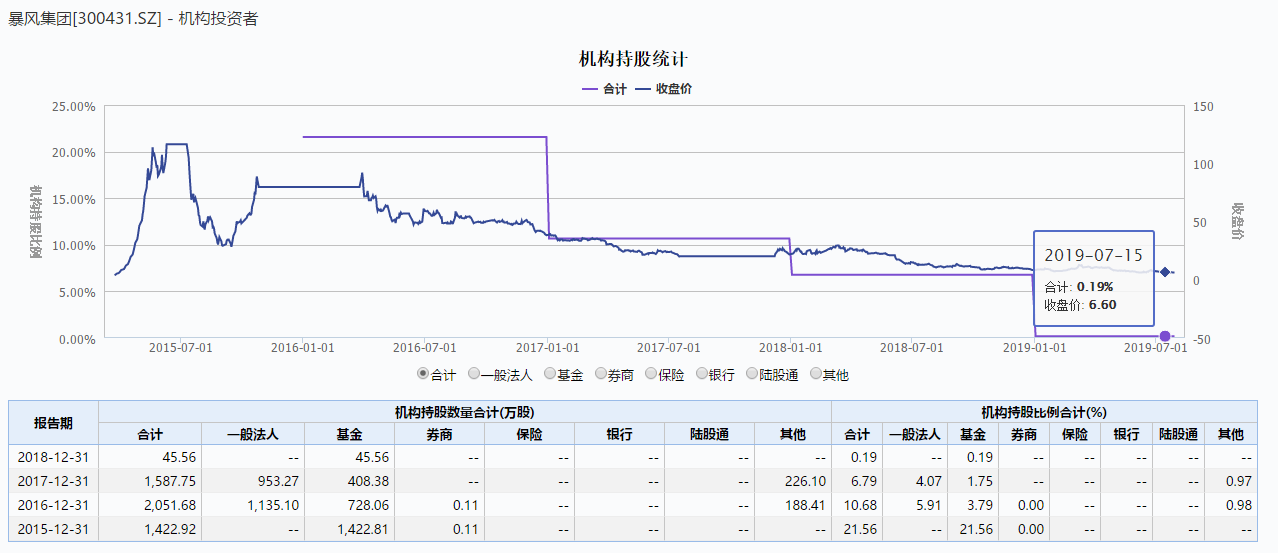 纵观暴风集团2015年上市以来的机构持股变化,呈现出持续减少的态势。2015-2018年四年的年报显示,机构持股比例(占含锁定股的流通股比例)分别为21.56%、10.47%、6.75%和0.19%。四年间,持股机构数量分别为37家、63家、45家和31家。